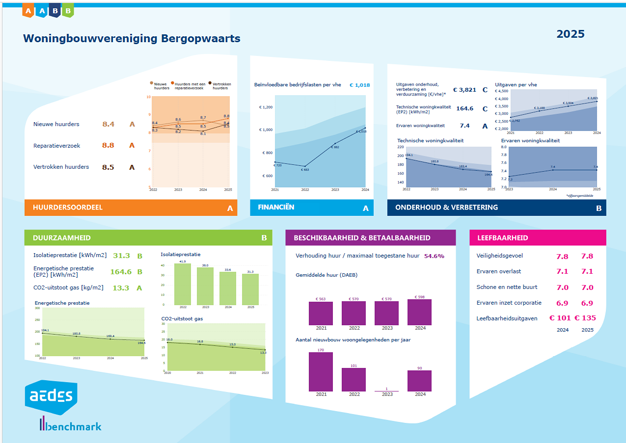 Elk jaar laat Bergopwaarts prestaties meten via de Aedes-benchmark. Deze landelijke vergelijking geeft inzicht in hoe woningcorporaties het doen. In 2025 deden 256 corporaties mee, samen goed voor 98% van alle sociale huurwoningen in Nederland.